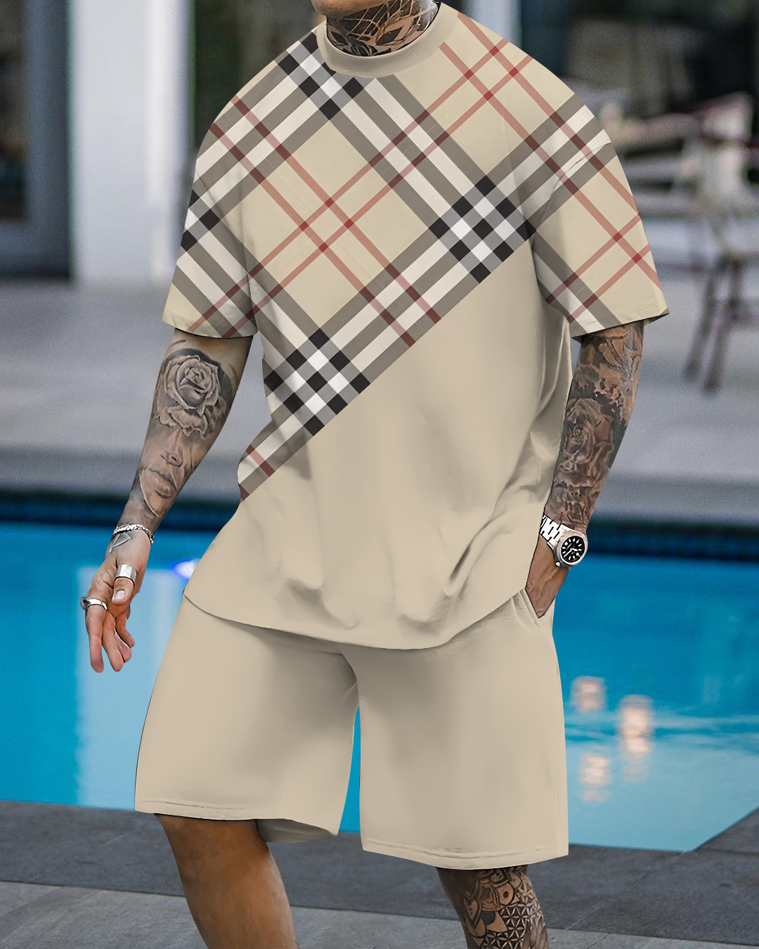 Men's fashion casual color matching printed short sleeve pocket shorts two-piece set