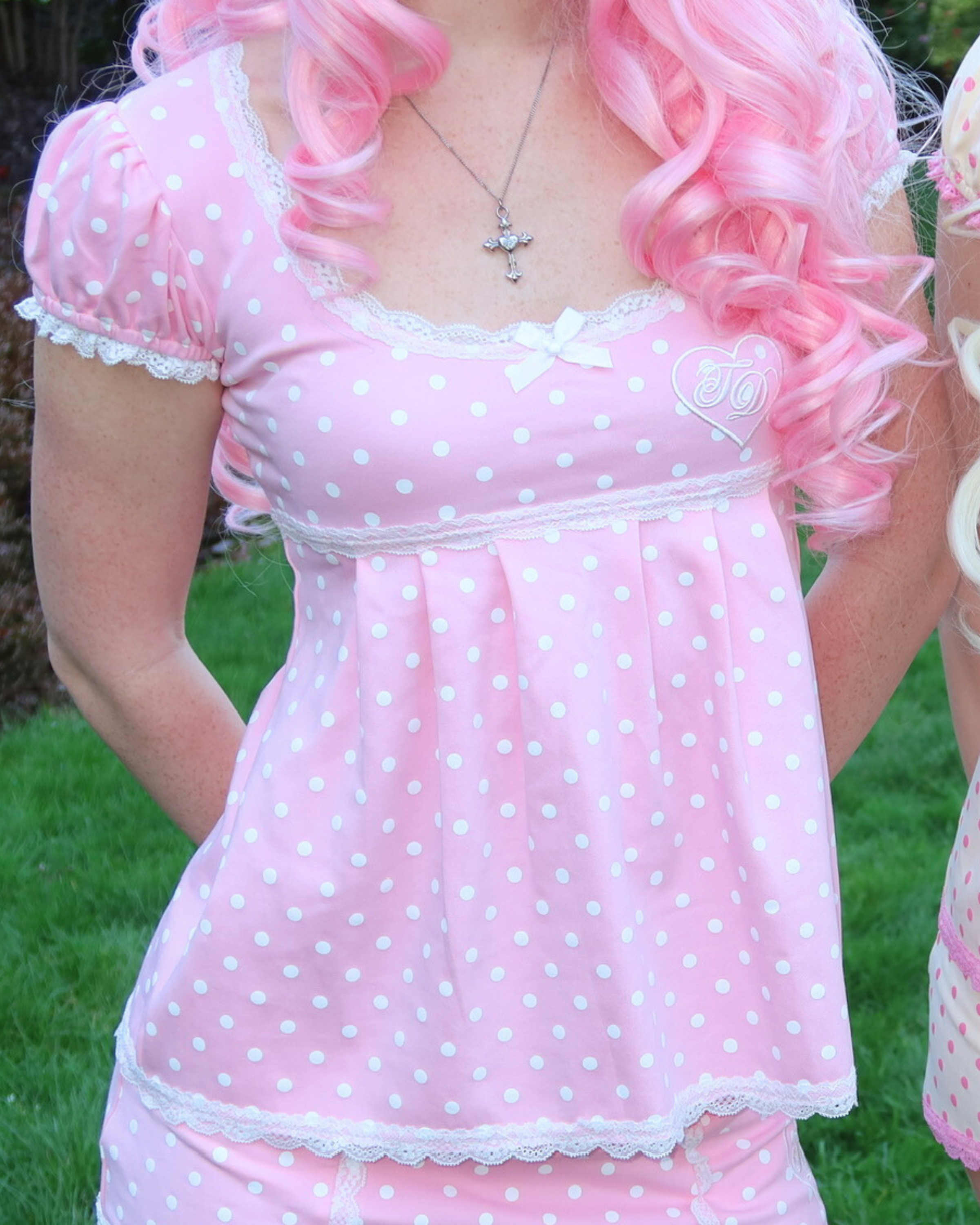 Our scoop neck babydoll top now with puff sleeves in our Strawberries and Cream polka dots! ♡