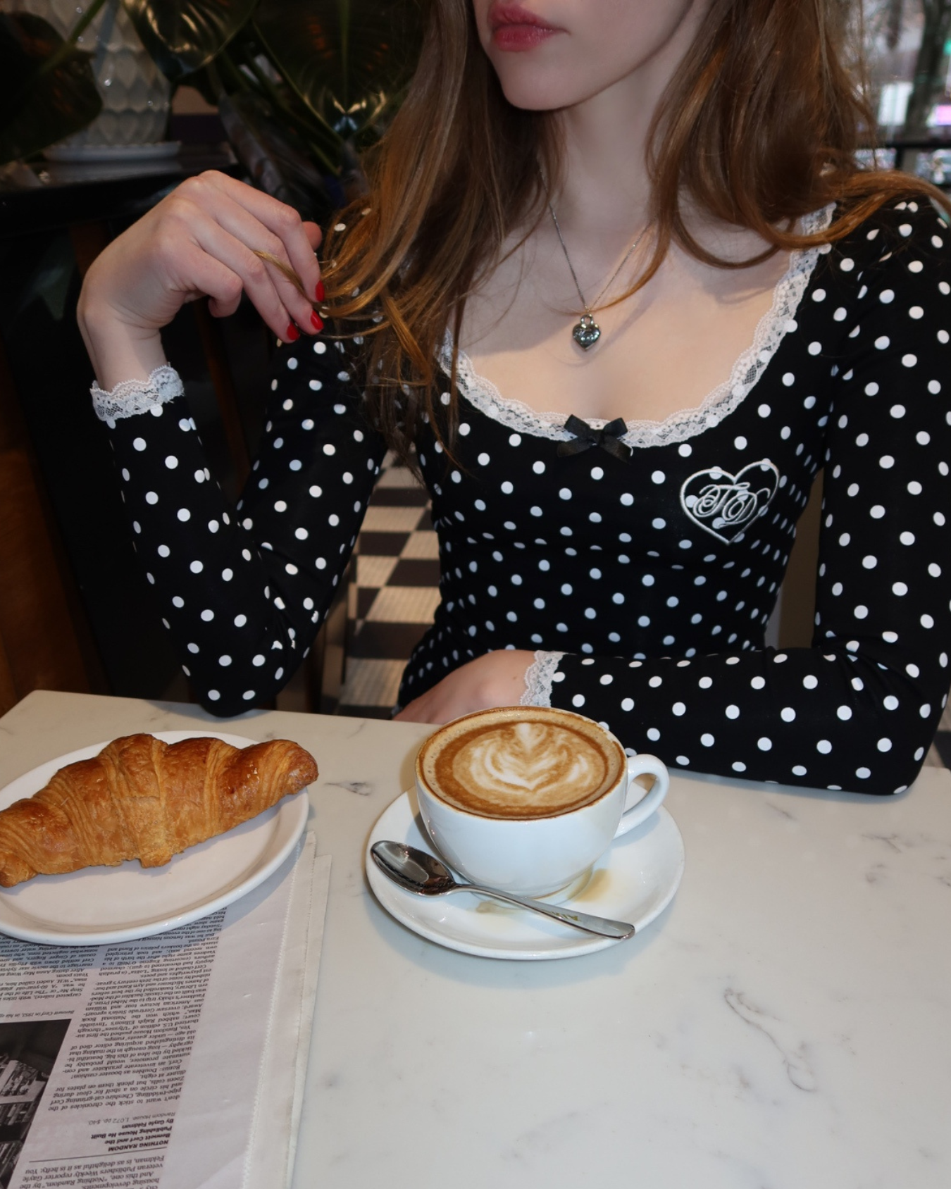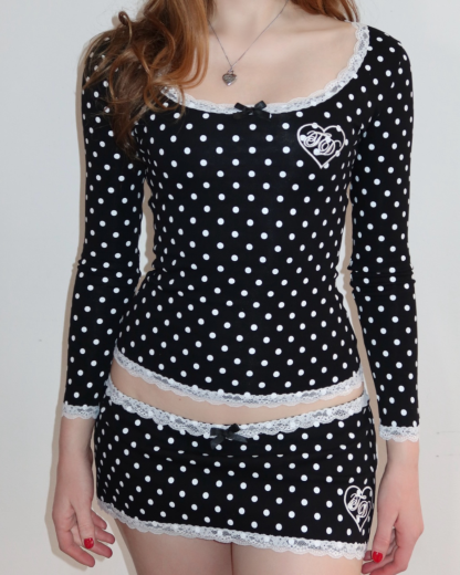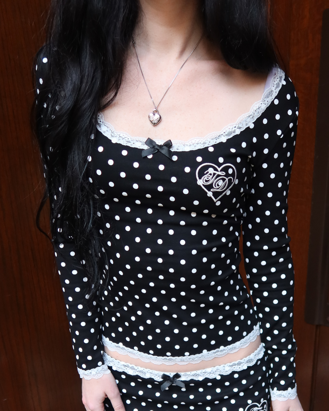 NEW Frenchie Chelsea Long Sleeve features our flattering perfect fit with a scoop neck, long sleeves, lace detailing, and an all-over white polka dot print.