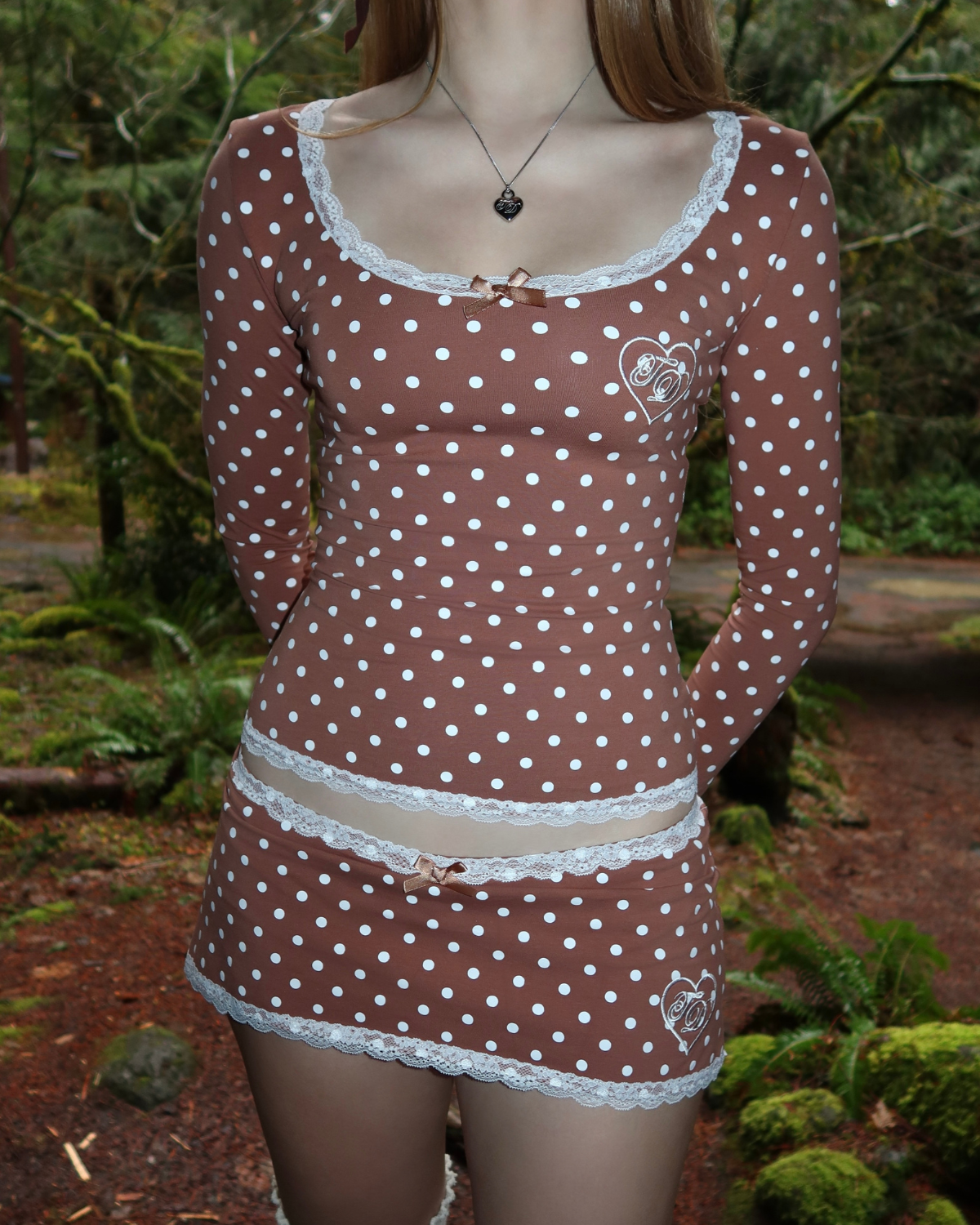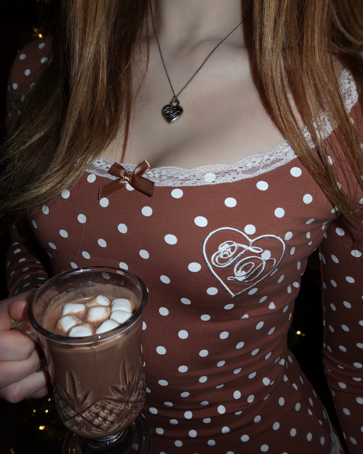 The Hot Cocoa Chelsea Long Sleeve features our flattering perfect fit with a scoop neck, long sleeves, lace detailing, and our new brown and white polka dot print.