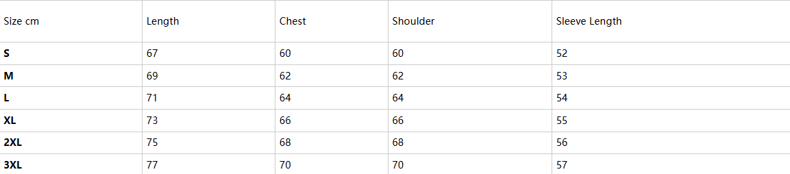 Length Chest Shoulder Sleeve Length S 67 60 60 52 M 69 62 62 53 L 71 64 64 54 XL 73 66 66 55 2XL 75 68 68 56 3XL 77 70 70 57