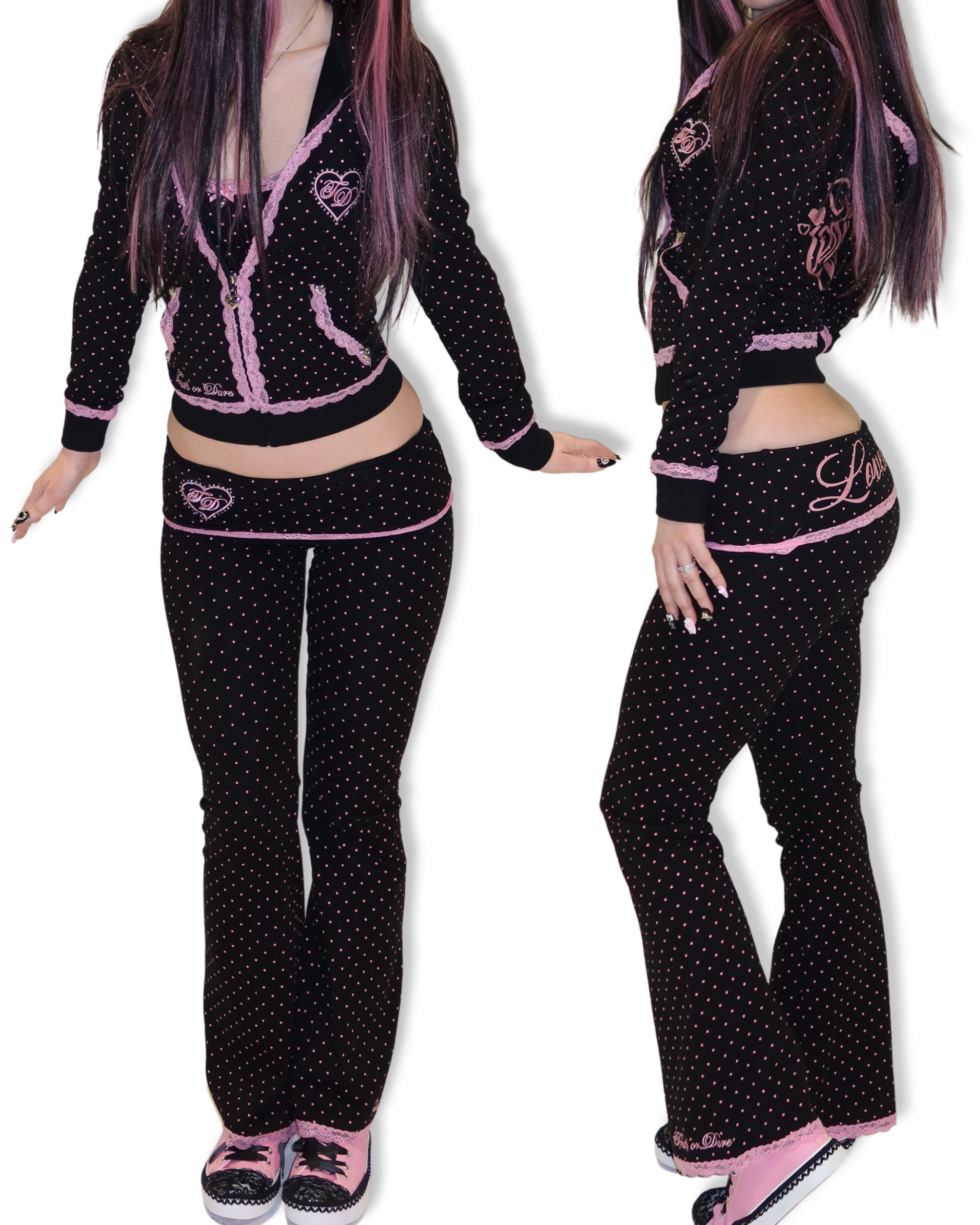 The Truth or Dare Tracksuit now in our Lovestruck polka dot! With Lovestruck glitter back print, lace, rhinestones, custom rivets, custom zipper pull, and embroidery details ♡
