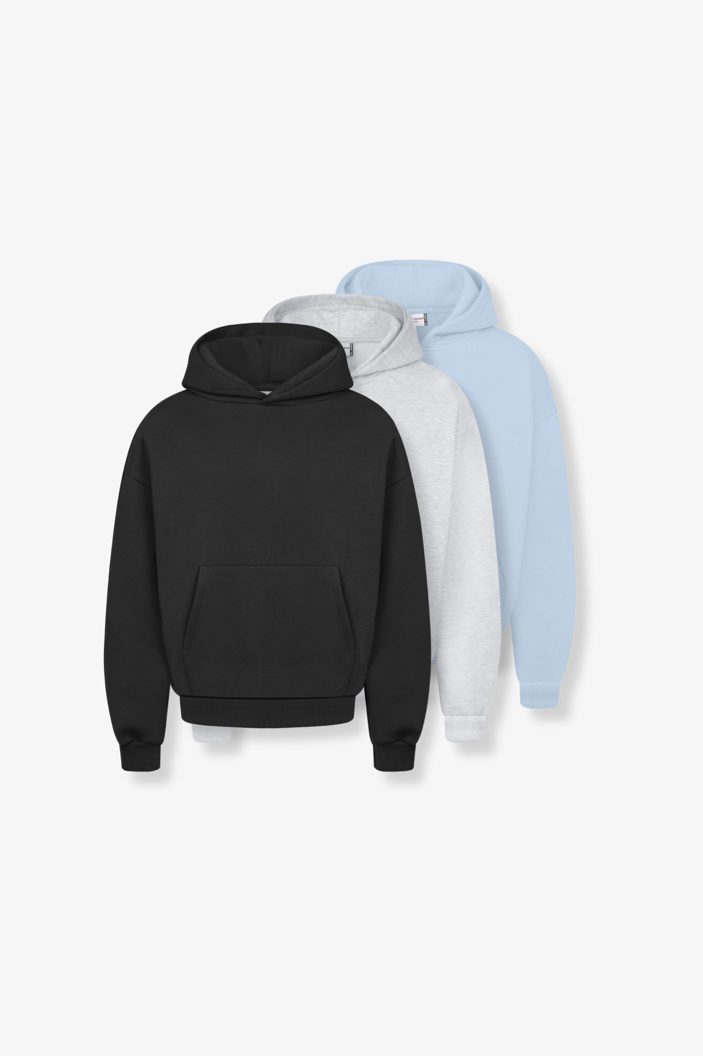 • 3er Set Heavy Blank Hoodie Black, Heather Grey, Baby Blue