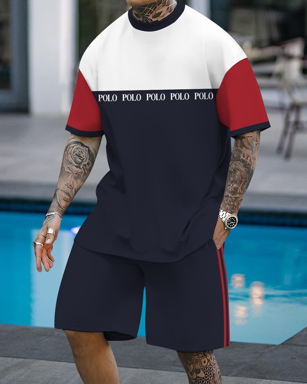 Men's fashion casual color matching printed short-sleeved two-piece set