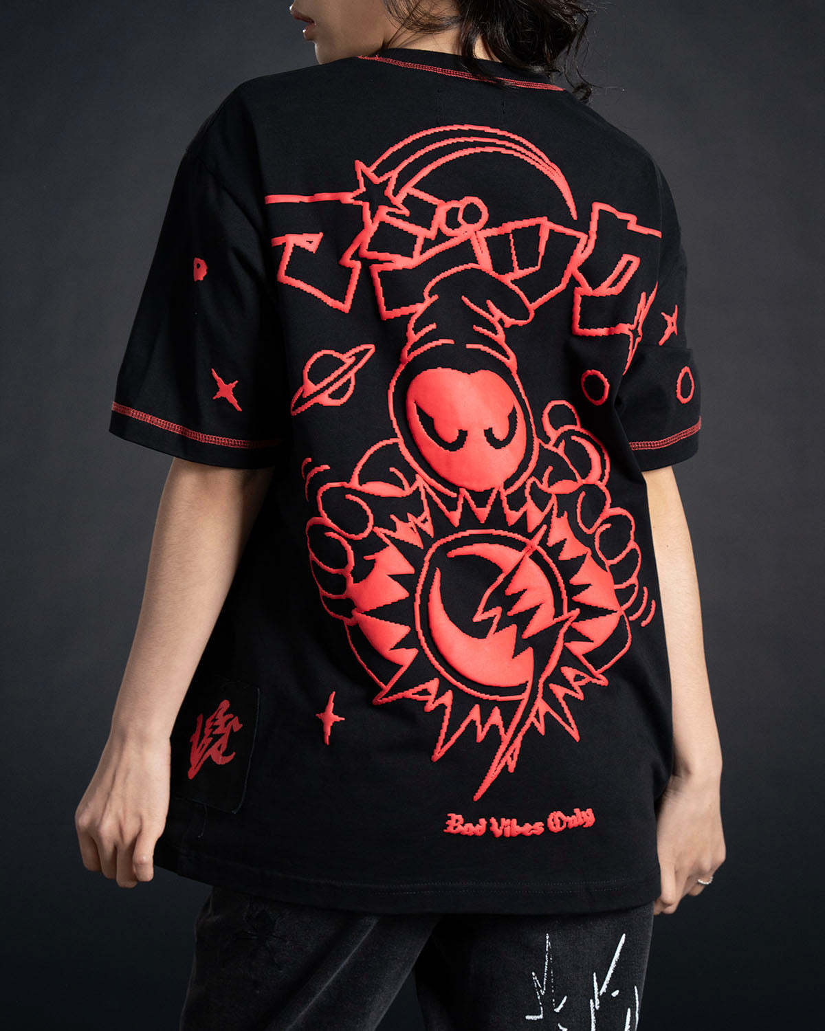 - Massive red puff print on black tee